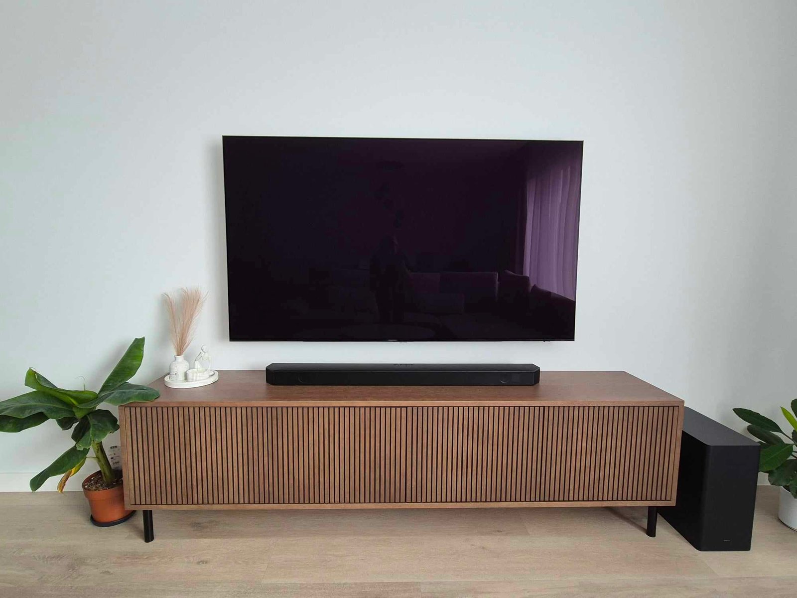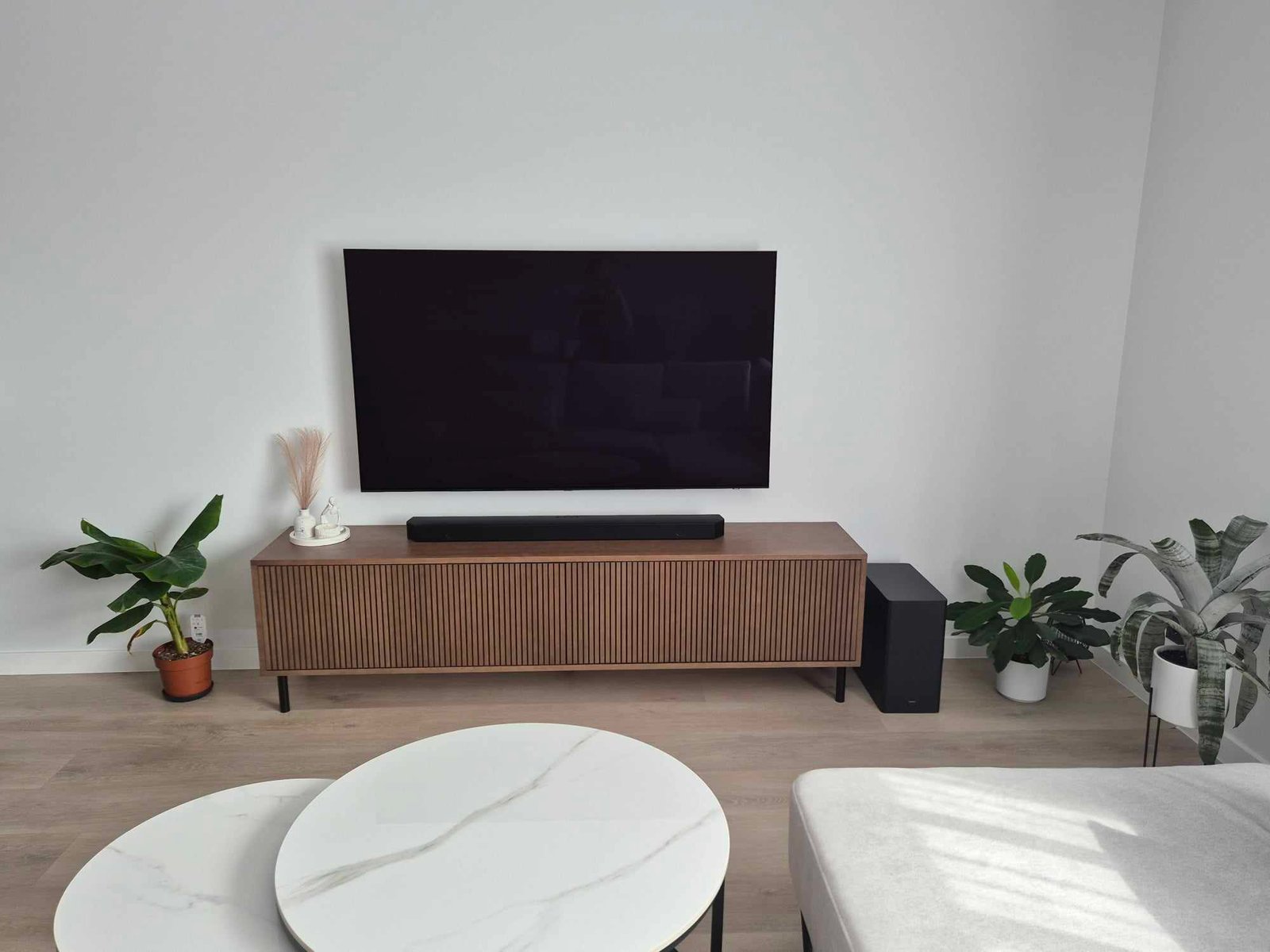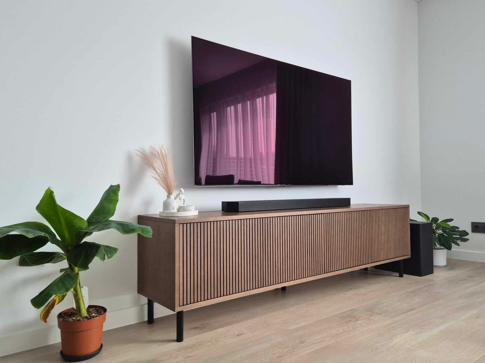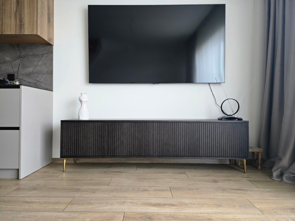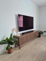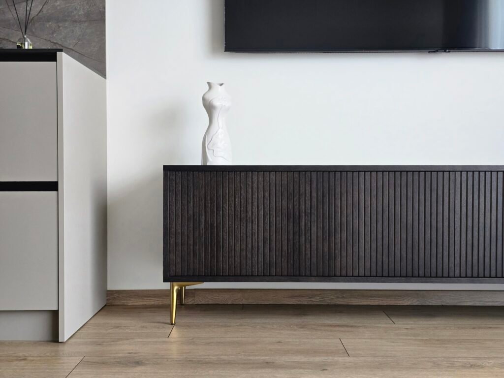 Šis TV baldas iš ąžuolo lukšto (spalva MCO6043) išsiskiria subtiliu vertikaliu reljefu ir tvirta, bet vizualiai lengva konstrukcija. Tamsios, minimalistinės kojelės suteikia baldui modernų charakterį, o šiltas medžio atspalvis įneša jaukumo į interjerą. Baldas gali būti montuojamas tiek pastatomas ant kojelių, tiek pakabinamas – pagal poreikį ir stilistiką.