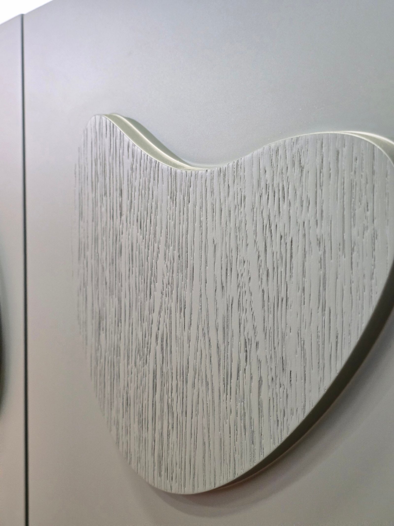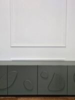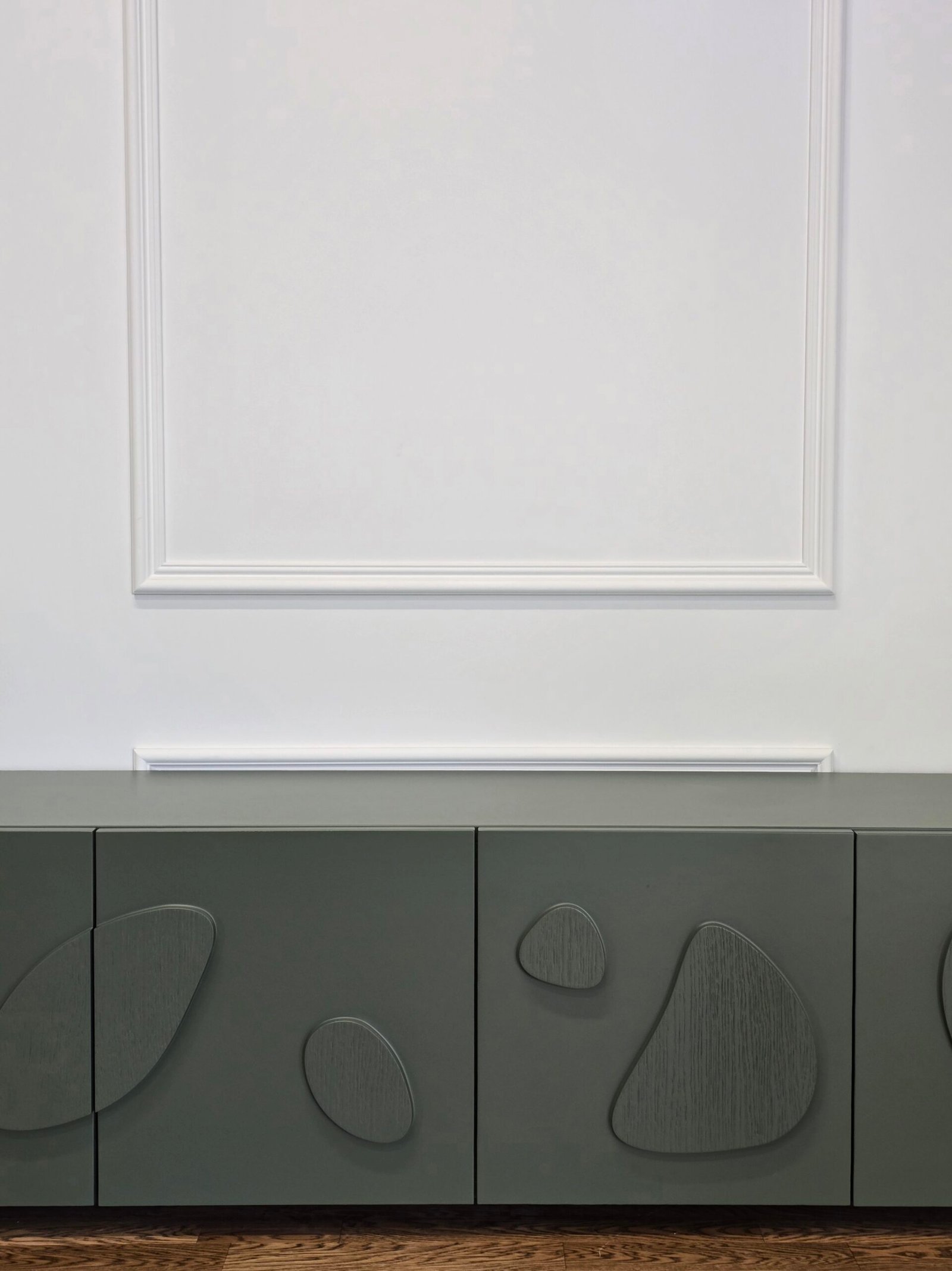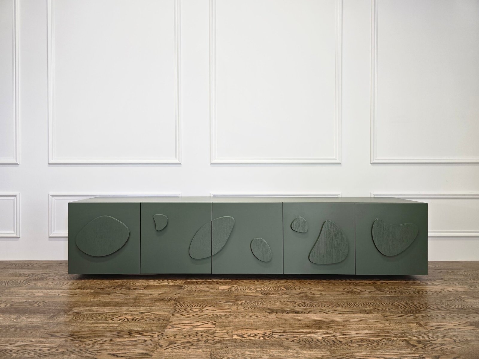 Šis unikalus TV baldas išsiskiria netradiciniu dizainu – fasadas dekoruotas į reljefą įleistomis organiškomis formomis, kurios primena gamtos įkvėptus siluetus. Gili žalia spalva (NCS S6010-G30Y) suteikia baldui ramybės, solidumo ir stiliaus pojūtį, o paprasta forma leidžia dizaino detalėms kalbėti už save. Tiek modernus, tiek meninį prieskonį turintis baldas puikiai įsilieja į išskirtinius interjerus.
