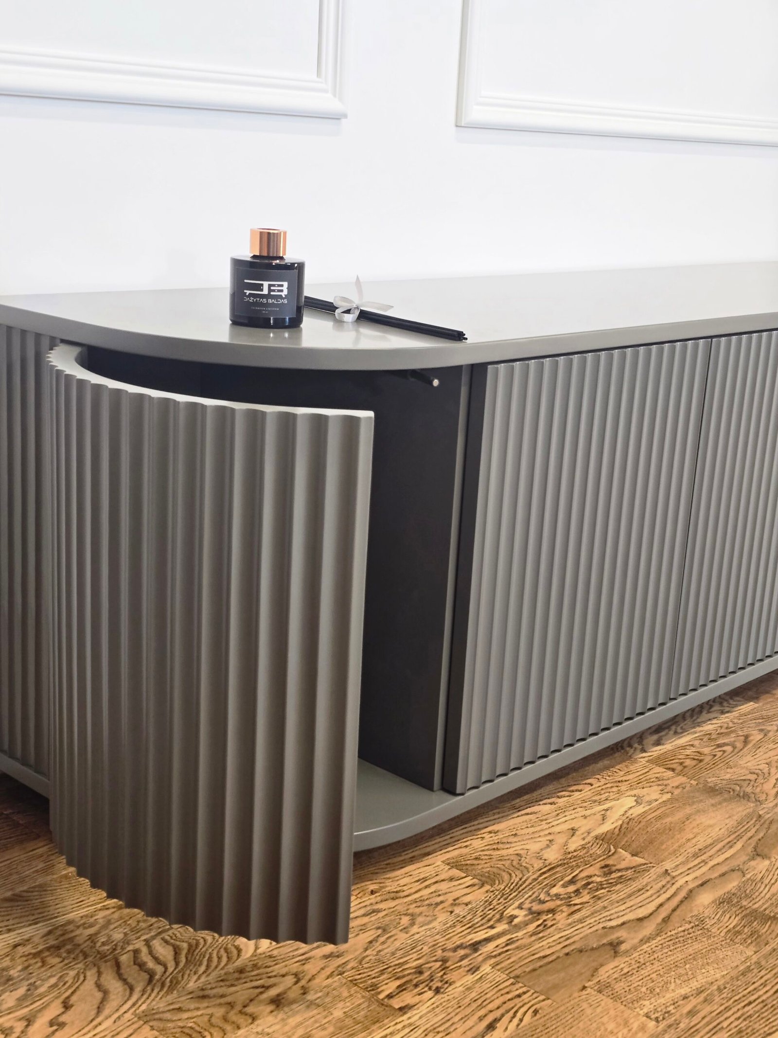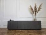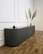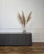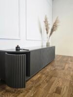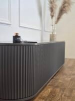 Šis pakabinamas TV baldas išsiskiria švelniai užapvalintais kampais ir vertikaliu dekoru, kuris suteikia fasadui išskirtinumo bei ritmo. Modernus, solidus dizainas puikiai tinka ieškantiems prabangos ir funkcionalumo derinio šiuolaikiniame interjere.